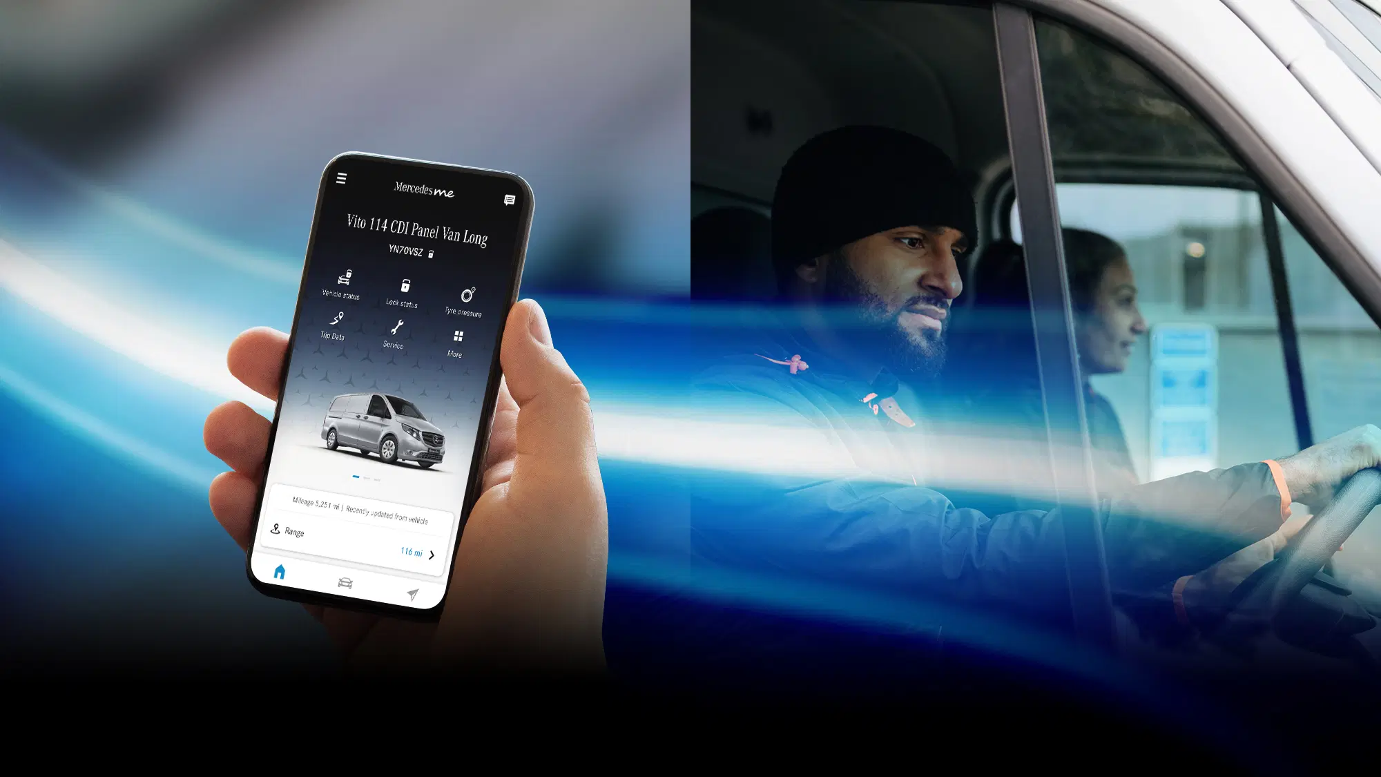Su mūsų paslaugų produktais palengvinkite savo darbo dienas ir kasdienybę. Jei kelionės komerciniu automobiliu metu įvyktų techninis gedimas, „MobiloVan" mobilumo draudimas ir „Service24h" padės Jums 24 valandas per parą, 7 dienas per savaitę. Naudodami „Mercedes-Benz" programėlę galite stebėti ir valdyti savo automobilio funkcijas tiesiog telefone.